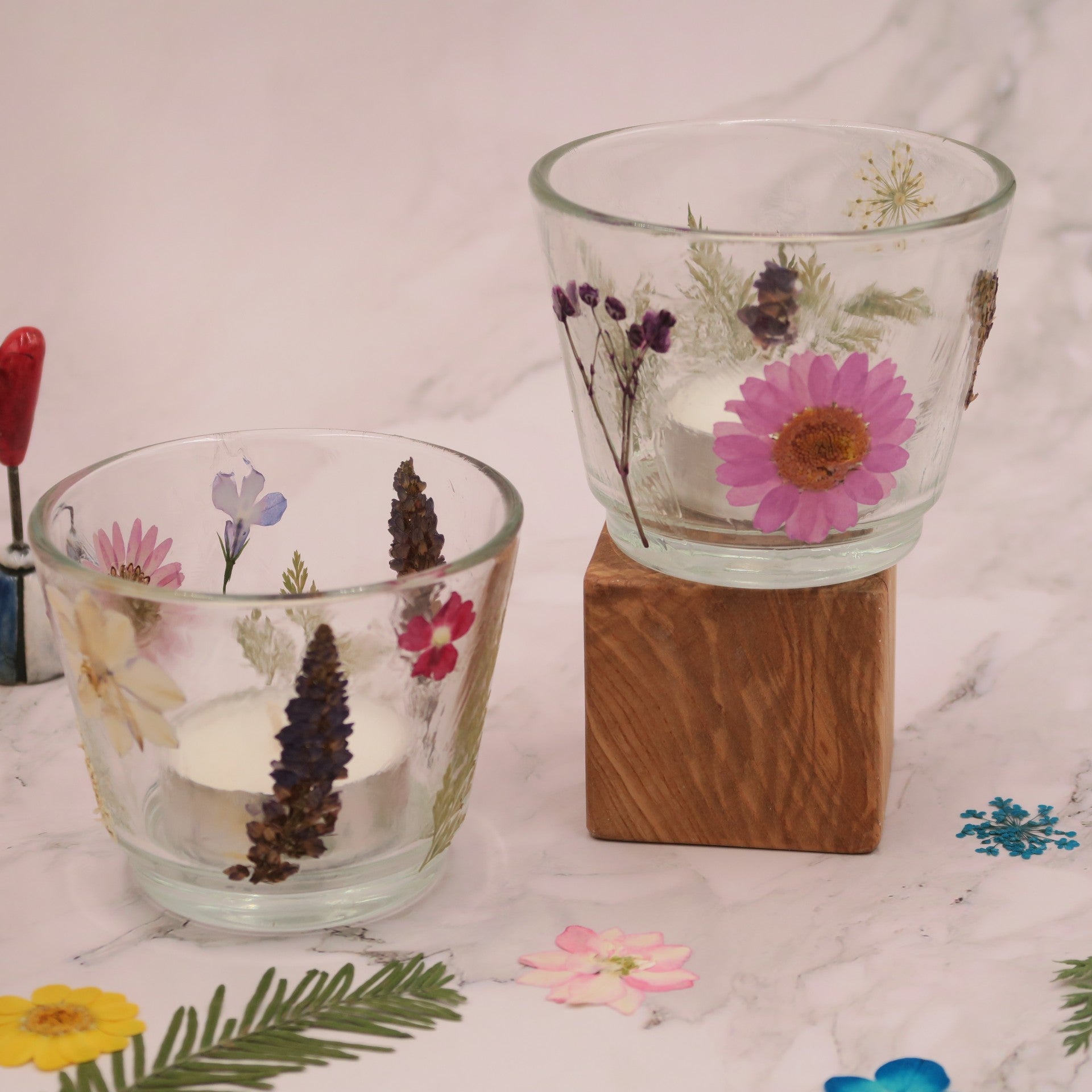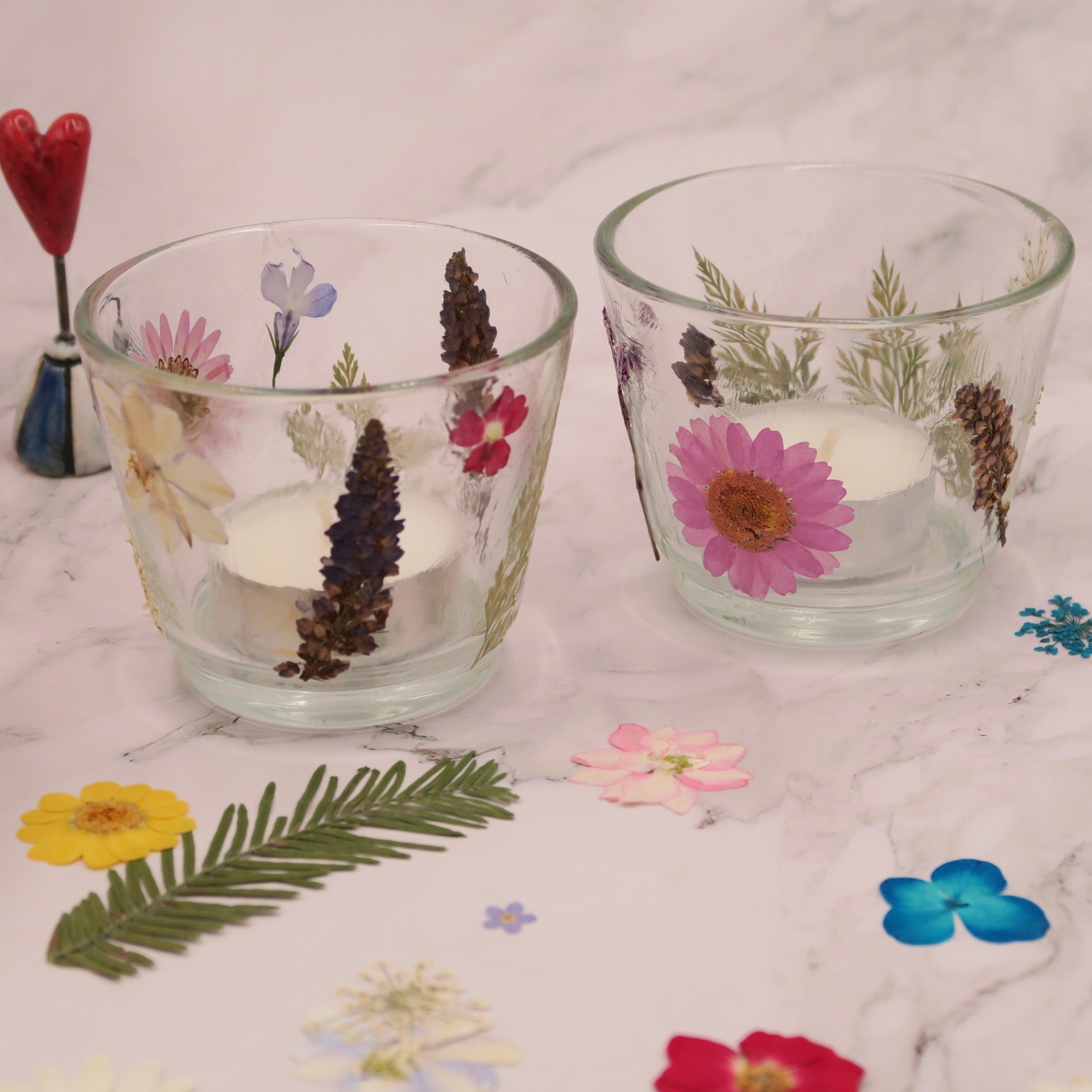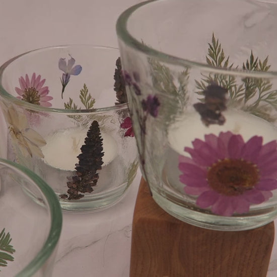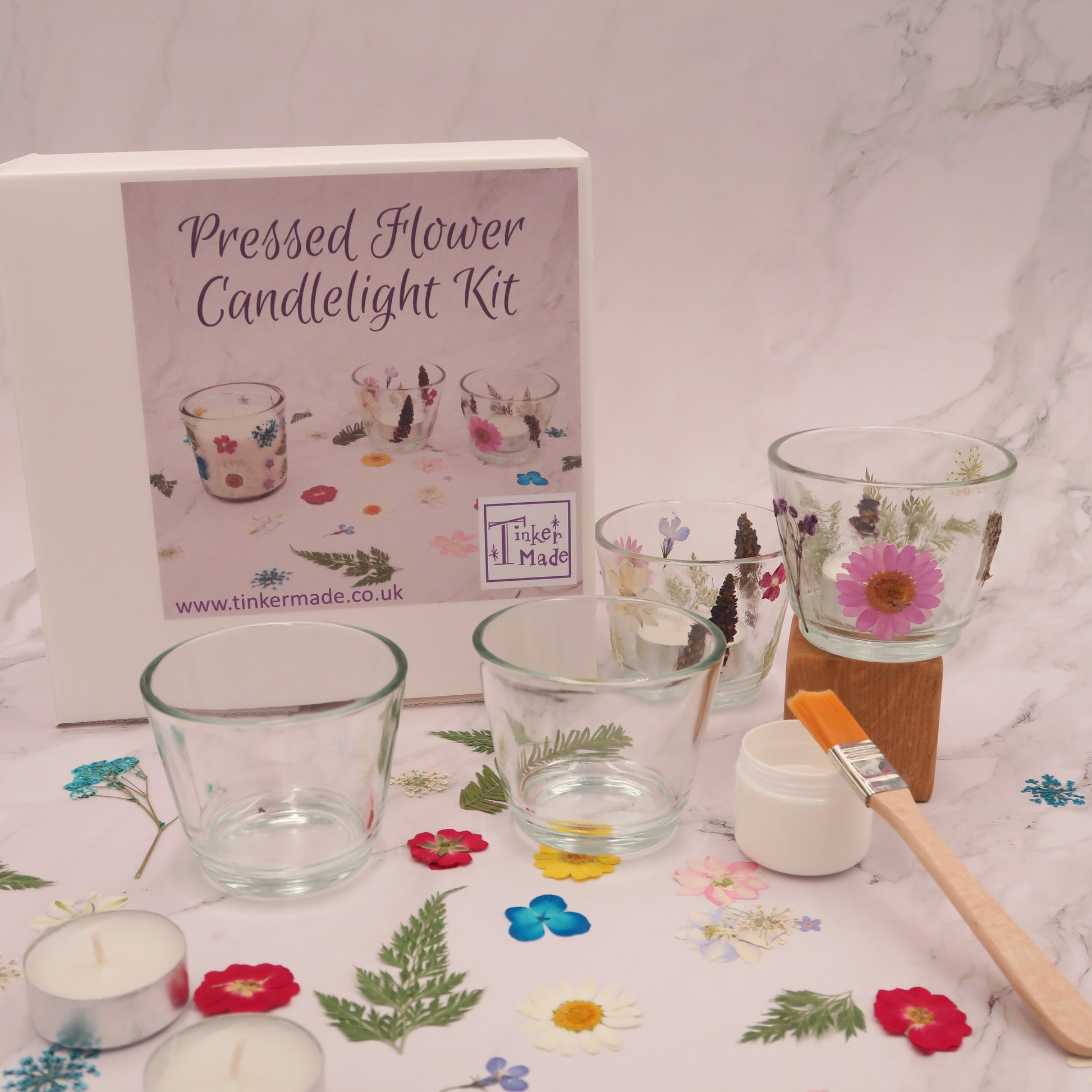 Each kit contains either a scented candle in glass OR two glass tealight holders (and two tealights), set of real pressed flowers (as chosen by you), PVA glue, small brush and instructions. All you need is some time to create.